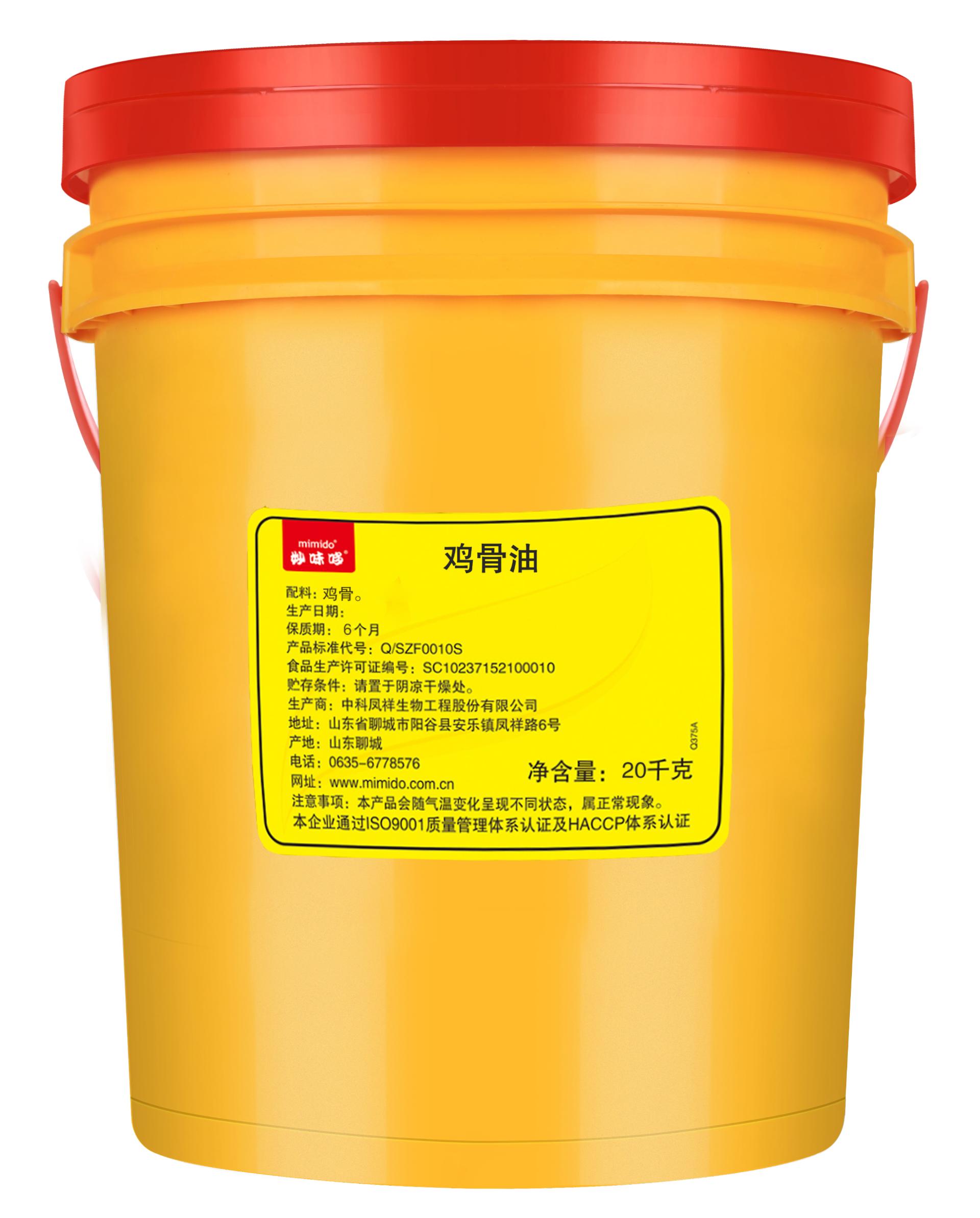 | 鸡骨油 | 精选鸡脂肪、鸡骨肉为原料,经熬煮、分离等生产工艺,采用自动化控制、流水线生产的先进设备精制而成。 产品保留了鸡脂的营养价值、鲜味、香味,具备天然调味增鲜功能。 | 20kg/桶 | 1.可用于方便面汤料、鸡(牛)精、鸡(牛)粉、肉类及水产加工、休闲及膨化食品、饼干的生产加工; 2.用于火锅底料、面食煎炸、家庭烹饪; 3.可用于作为油状香精的载体。 |
